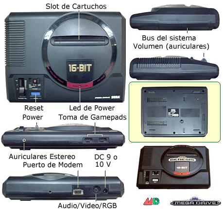 | En plástico negro con formas redondeadas, rectangular (28 x 21 x 6 cm ) con 2 tomas de Joystick Sega Megadrive en el frontal a la derecha y a la izquierda jack stereo. Sobre este, regulador deslizante de volumen, interruptor de Power (en las PAL-B y Megadrive japoness además bloquea los cartuchos de su zona mediante un gatillo que se encaja en una ranura en el lateral izquierdo del cartucho; si no está presente la ranura, puede usarse pero no queda bloqueado) y boton de Reset (azul las de Asia, gris las europeas y americanas). Slot de cartucho en una zona circular con diferentes leyendas según zona y fecha. En la trasera, toma de alimentación (10 V las europeas, 9v el resto), salida A/V/RGB DIN 8, modulador TV (en algunas conmutador de canal, en otras sin modulador ) y toma AUX (solo primeros modelos; se utiliza para conectar el MegaModem). En el lateral derecho,tapado por una trampilla y funda roja, bus del sistema para conectar con un Mega CD. |
